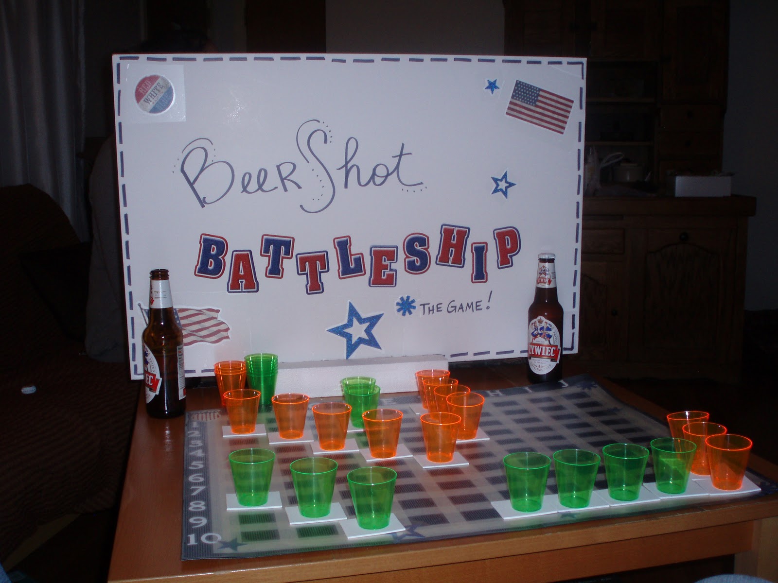 So, the game is played exactly like regular Battleship except that instead of inserting a peg once your ship gets hit, you fill that cup up with beer and take a shot. In the original rules, the shots were to be consumed, all at once, after your ship has been sunk. However, after 5 quick shots of Zywic, I nixed the idea and switched it over because I quickly realized, I'm not in college anymore :( Play either way you like, but be ready because it gets pretty competitive.