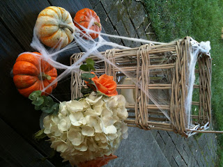 For the next two flower arrangements, I used white hydrangeas (I'm fairly sure that's what they are called. I had to look it up. I usually call them the fluffy white flower balls), orange roses and pumpkins which were all purchased at Trader Joe's for a little over $15.00. Once again, I reused some materials from earlier projects, then went crazy, absolutely crazy, with the spider webs.