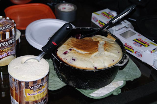 As dinner was wrapping up Coach John prepared Hutch's dutch ovens for dessert -- fresh blackberry & apple cobbler. Check out the picture of his amazing dessert! Throw in some vanilla ice cream, friends and roaring fire for one heck of a memorable evening.