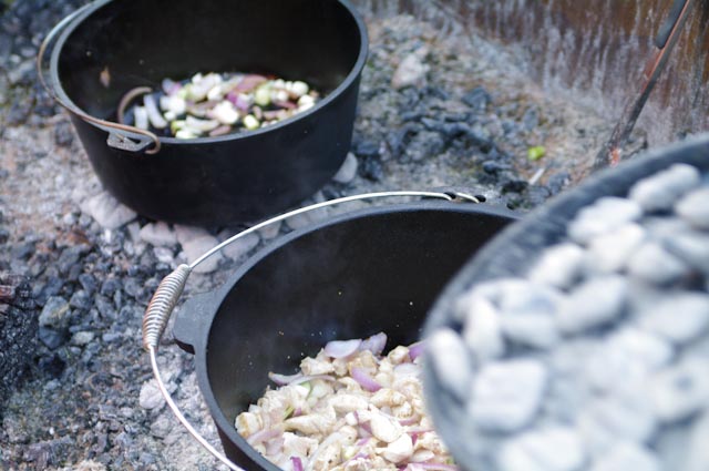 While the men and women were out collecting berries and exploring the river, I got the dutch ovens ready for the dinner. I'm the first to admit that I'm a dutch oven rookie but I enjoy the experience of cooking outdoors over a fire. Honestly I was nervous about cooking for both teams. Besides preparing a new recipe I was also cooking for the women's team. Over the years I've learned that guys get hungry in college and are grateful for any meal I cook. They, in turn, have learned to heap praise on my cooking so I keep cooking for the them. Not sure if this is an example of a symbiotic relationship or a positive feedback loop, but it seems to work well. However I wasn't sure how the women would react to my cooking. I used this