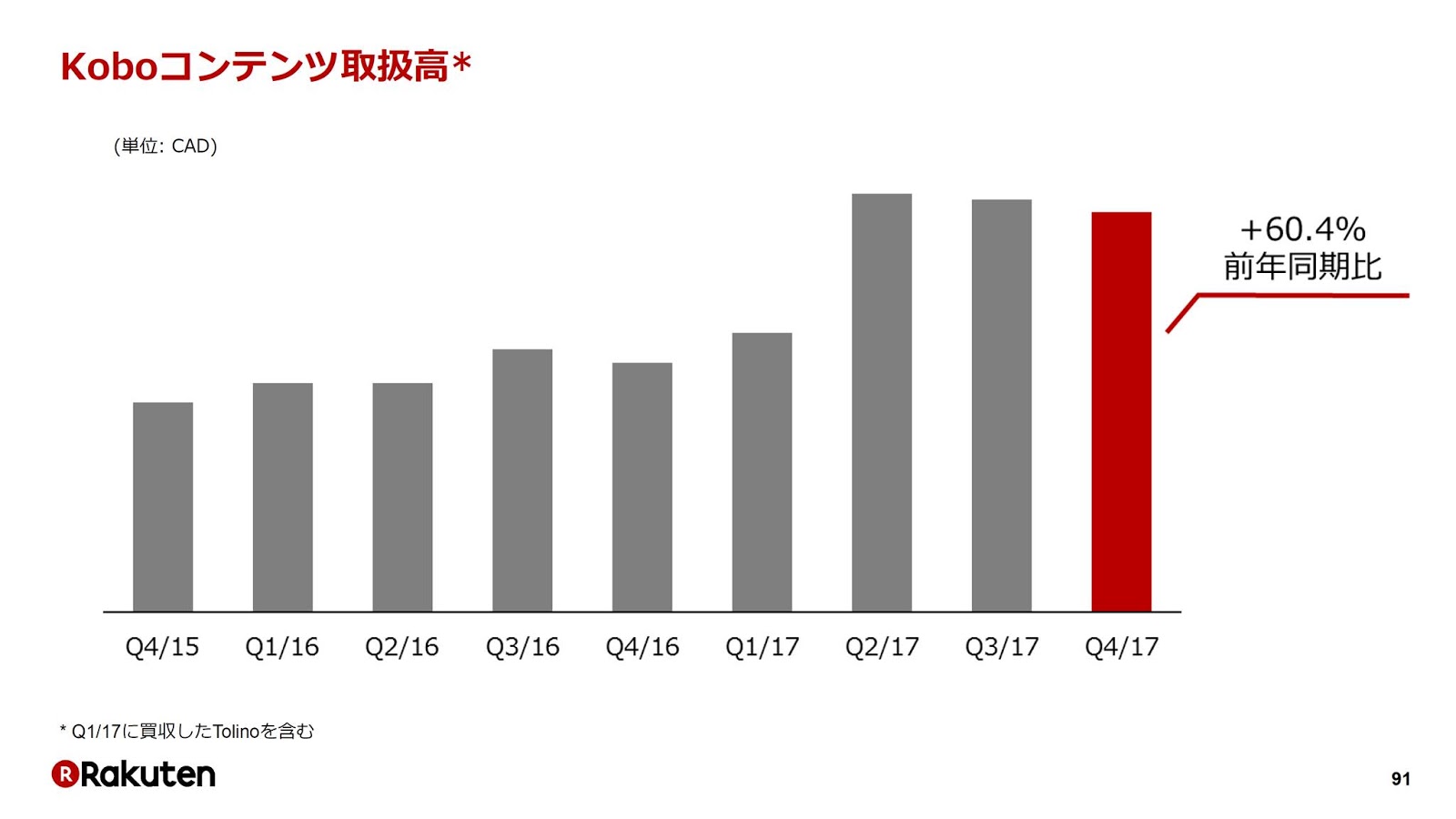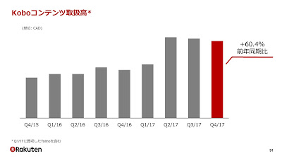 を確認してみました。2017年度通期及び第4四半期のスライド資料に、「Kobo」と「OverDrive」 はそれぞれ1ページだけ。縦軸に数字が書かれていない推移グラフで、前年同期比の成長率が示されているのみ。なんか、もうちょっと情報公開しなさいよという感じが。ちなみに「Kobo」の取扱高グラフ(下図)は2017年第2四半期に急増していますが、2017年に買収したドイツ「Tolino」を含んだ数字でした。