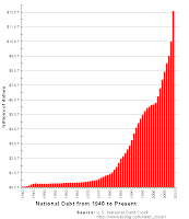 Unlike the spilled milk example where everyone agreed he (or she) did not mean it, as adults we must have enough wisdom to hold people responsible for results, not intent. While the concept of unintended consequences has been around for centuries if not longer, the idea that only the intentions should be measured has not. It is a dangerous idea that when applied to public policy is a disaster. The growth of government can be tracked to dealing with the unintended consequences from programs like “The New Deal”, “The War on Poverty”, or Fair Housing Initiative”. Each response then has its own unintended consequences to deal with. The added regulations attack our freedoms and result in the debt chart shown.