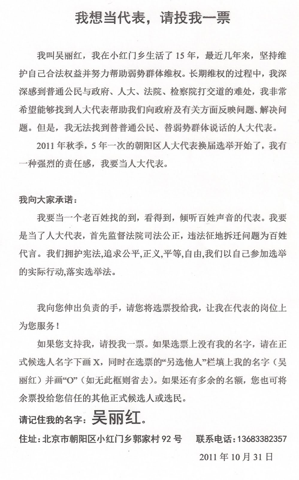[吴丽红拆迁维权博客] 北京13位联合参选人之一吴丽红参选公告