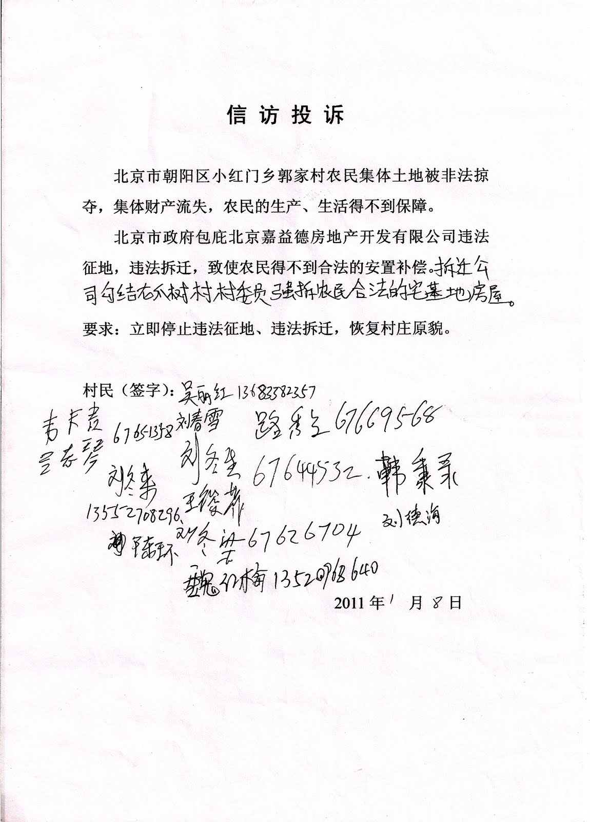 北京市政府包庇北京嘉益德房地产开发有限公司违法征地,违法拆迁,致使农民得不到合法的安置补偿,拆迁公司勾结龙爪树村村委员强拆农民合法的宅基地房屋。(附:信访投诉)