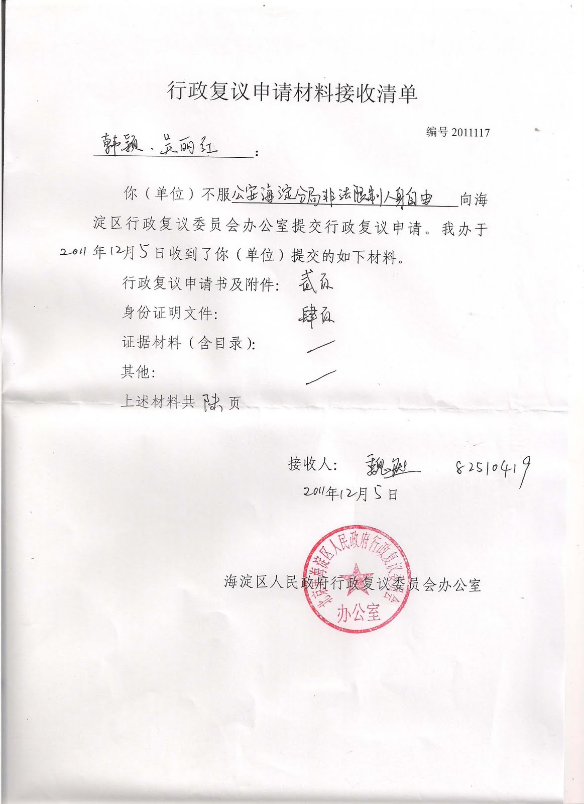 被申请人:北京市公安局海淀分局 法定代表人:尹燕京 局长