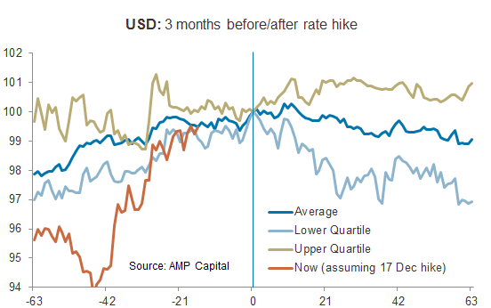 The path of the USD will be a critical part of the outlook for interest rates. History shows us that the exchange rate does most of its work in anticipation of higher interest rates – the classic case of “buy the rumour, sell the fact”. That said the fact that the Fed and the ECB (along with the BoJ and the PBoC, amongst others) are on divergent monetary policy paths will limit the extent to which the Fed can tighten.