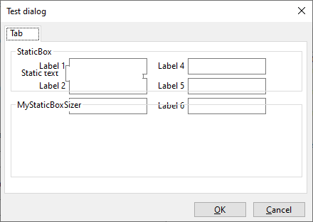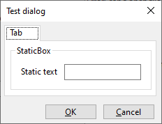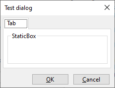 + Centre(); +} + +void MyTestDlg::CreateControls() +{ + wxBoxSizer* topSizer = new wxBoxSizer(wxVERTICAL); + SetSizer(topSizer); + + wxNotebook* nb = new wxNotebook( this, wxID_ANY ); + + wxPanel* panel = new wxPanel( nb, wxID_ANY, wxDefaultPosition, wxDefaultSize, wxTAB_TRAVERSAL ); + wxBoxSizer* pageSizer = new wxBoxSizer(wxVERTICAL); + panel->SetSizer(pageSizer); + + wxStaticBox* staticBox = new wxStaticBox(panel, wxID_ANY, _("StaticBox")); + wxStaticBoxSizer* staticBoxSizer = new wxStaticBoxSizer(staticBox, wxVERTICAL); + pageSizer->Add(staticBoxSizer, 0, wxGROW|wxALL, 5); +