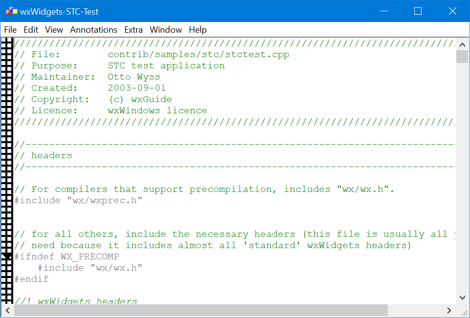 Code Example (click to expand)#include <wx/wx.h> #include <wx/stc/stc.h> #include <wx/file.h> class MyApp : public wxApp { public: virtual bool OnInit(); }; class MyFrame : public wxFrame { public: MyFrame(); }; wxIMPLEMENT_APP(MyApp); bool MyApp::OnInit() { MyFrame* frame = new MyFrame(); frame->Show(true); return true; } MyFrame::MyFrame() : wxFrame(NULL, wxID_ANY, "STC scrolling issue") { wxBoxSizer* sizer = new wxBoxSizer(wxVERTICAL); this->SetSizer(sizer); wxStyledTextCtrl* stc = new wxStyledTextCtrl(this); stc->SetScrollWidthTracking(true); sizer->Add(stc, 1, wxEXPAND, 0); this->Layout(); this->Maximize(); wxMemoryBuffer memBuff; wxFile f_in("img.jpg"); wxFileOffset fLen = f_in.Length(); char tmp; for (wxFileOffset i = 0; i < fLen; ++i) { f_in.Read(&tmp, 1); memBuff.AppendByte(tmp); memBuff.AppendByte(0); } stc->AddStyledText(memBuff); }