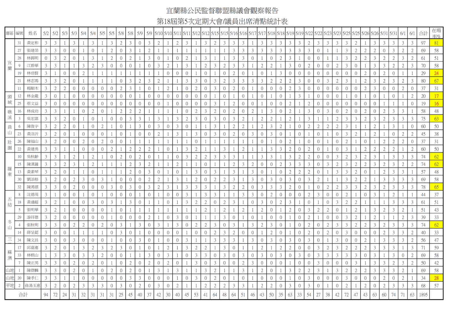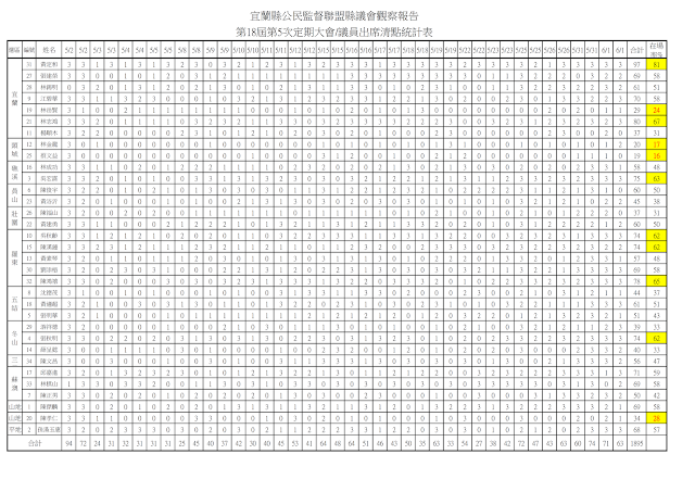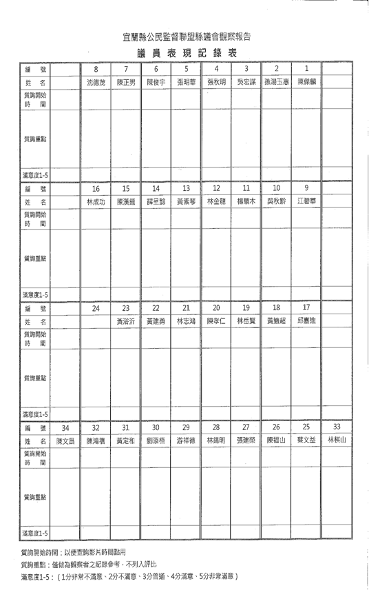 社團法人宜蘭縣公民監督聯盟 宜蘭縣議員2017上半年問政表現觀察總報告 文/社團法人宜蘭縣公民監督聯盟 壹、前言 2011年成立的『宜蘭縣公民監督聯盟』(簡稱「宜督盟」)本著公平、客觀精神自2013至2016,共辦理了四次議員評鑑,促成宜蘭縣議會成為全國透明度第二高的議會。今(2017)年,將議員評鑑改成議會觀察,要用明確數據,針對過去選民較少注意議員的在場率、質詢內容、專題報告專業度、聘請助理額度、建設經費運用等面向,為選民呈現客觀的事實與數據,讓選民得知自己選區議員的整體表現。 宜督盟為揭開議會長期以來,簽到出席率雖高,實際在場率卻低下的事實,透過這次議會觀察報告有詳盡的數據與資料,呈現所選出的議員在開議期間的參與度與在場率是如何,以供選民參考。 議員在議會的質詢是不是言之有物,一直是宜督盟所關注的焦點,宜督盟曾多次對質詢次數質詢內容加以評分評鑑,本年度開始,以開議一個月期間,每星期選出有效質詢影片,內容有憑有據,獲選之議員也善加利用其質詢影片廣為宣傳,以期帶動議會質詢內容品質的提昇。 為使不負所民所託,宜督盟在本會期要求議員應公布所聘的助理名單、建設經費去向,在本報告書中,可以看出哪些議員已走在時代的前端以示向選民負責。 議會在開議時得要求縣府在會議期間針對特別議題提出專題報告,這一向是縣民及媒體所最關注的焦點,也是展現議員們有沒有做功課、縣府有沒心決解問題的參考指標;過去宜督盟較少在此處著墨,今年觀察報告特別增加對專題報告的分析,以檢驗議員及縣府的專業能力。 宜督盟一本初衷,希望議員好,督促縣府更好;這份報告希望縣府及議會資料「全都露」,提供議員、縣府官員及關心政治的朋友們參考,期許現任議員知所榜樣及警惕,也期待更多公民一同關心公共事務,加入公民監督行列。 貳、觀察方法與實施: 一、為回應宜蘭縣議會對宜督盟評鑑辦法之各種意見,經宜督盟2017年1月8日第二屆第十六次理監事聯席會議編號10決議,廢止「宜蘭縣議會第十八屆定期會議員評鑑辦法」,並新訂「宜蘭縣議員問政表現觀察報告實施辦法」(如附件一)持續監督議會。 二、原評鑑辦法主要以議事錄為評鑑工具,議事錄出刊時時效已過,恐有失真之虞。 三、評鑑所需為民服務資料,多數議員認為恐有涉及個資問題,提供意願不高。 四、本次由評鑑評分改為觀察公布,乃著眼於客觀數據之呈現,減少人為主觀評分,個別議員表現可由公民經由這些客觀數據及議員質詢影片自行評斷。 五、觀察報告實施辦法主要觀察揭露項目為: (一)出缺席(依當天議事錄為準) (二)質詢次數(依當天議事錄為準) (三)公共性議題質詢影片彙整及公布,供公眾檢視討論 (四)公布助理名單(如附件二) (五)公布基層建設經費。 六、依每年上、下半年兩階段各彙整成觀察報告,上網公告提供縣民參考,期許建立一個議員表現觀察平台,經由網路讓公民充分討論,達到全民監督之目的。 七、每天分上、下午各派1-2位志工至議會觀察,依議員出席紀錄表(如附件三)、議員表現紀錄表(如附件四)撰寫觀察紀錄,定時點名、拍照、提內部討論後,上傳宜督盟臉書粉絲專頁。 參、觀察與分析: 一、出席表現觀察報告《100%的出席簽到率與48%的實際在場率》 (一)議員出席會議乃是天職 很多公民可能不清楚,我們所選出來的代議士,必須在每年的五月和十一月於議會開會,就像上班族進公司要簽到或打卡;我們選出的代議士也要簽到。只是這樣的簽到,時常流於形式;且只要簽到,就算沒有進議會開會,除了每月固定18萬的薪資(含助理費),每天還可以多領2,450元的補助費(出席費1,000元、交通費1,000元、膳食費450元),中午議會還會供餐,還有議員的單人宿舍可供住宿(宿舍就在議會旁一棟深咖啡色的建築物,除了設備齊全的單人套房,還有健身中心、聯誼室、洗衣房)。 目前針對議員只簽到、就算未實際出席會議也可以領出席費2,450元一事,並無法可管,也就是說,議員們在法律上是站得住腳的。但請各位想想,我們選出議員不就是要監督縣府施政嗎?一年有12個月,僅兩個月定期會,議員們卻以跑紅白帖、為民服務、學業等各式各樣理由未與會,莫非議員助理的能力與人力都不足以處理紅白帖或服務案件嗎?連開會都不到場還領出席費,縣府的施政形同無人監督,這樣說得過去嗎? (二)在場率統計 有一句話說得好:『道德能彌補智慧的缺陷,但智慧卻永遠不能填補道德的空白。』不管議員們有三頭六臂的能耐或自以為是可以遙控監督縣政,這種道德上的瑕疵,促使宜督盟必須就議員實際出缺席狀況做完整紀錄,呈現在各位公民眼前。 宜蘭縣目前有33席縣議員,宜督盟志工於今年五月議會開議期間,每日輪派志工到議場監督,一天點名六次。並製作成整個月33席議員的點名統計表。 宜督盟本次公布五月開議期間,議員實際在場率60%以上名單及30%以下名單。 在場率60%以上名單如下:黃定和、林志鴻、陳鴻禧、吳宏謀、吳秋齡、陳漢鍾、張秋明。 在場率30%以下名單如下:林金龍、蔡文益、林岳賢、陳孝仁。 (三)期許議員有守有為 一個健全的民主體制得來不易,議員們千辛萬苦參選脫穎而出,選民們確實履行投票義務。然而,這樣反差如此大的出席率和在場率,選民們能接受嗎?若再調閱每日議會的議事錄,不難發現,簽到出席率真的是100%,但整個
