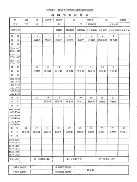 社團法人宜蘭縣公民監督聯盟 宜蘭縣議員2017下半年度問政表現觀察總報告 文/社團法人宜蘭縣公民監督聯盟 壹、前言 宜蘭縣公民監督聯盟(宜督盟),宗旨是發揮民間中道力量,監督代議部門問政等事項,以保障宜蘭縣民獲得正確資訊,藉此宣導民主理念,發展公民社會,謀取縣民之福。 宜督盟為揭開議會長期以來,簽到出席率雖高實際在場率卻低下的事實,透過實際在場監督拍照,呈現出真實結果,讓選民知道所選出的代議士是否實際在場用心問政。 議員在議會的質詢是否言之有物?是否針對問題探討?所問問題是否適切?有沒有做功課?而不是只是做戲,問政品質更值得本盟及選民在意。本盟特選出有效質詢影片,問政內容完整呈現,除提供選民參考,也督促代議士發揮更多為民喉舌影響力,以民主體制臻於健全甚幸! 為使不負選民所託,宜督盟要求議員應公布所聘助理名單、建設經費去向,及實地走訪全縣31位議員服務處拍照,察看服務處是否敞開大門或大門深鎖。 選民用選票選出議員,民主只進行一半。作家朱天心曾說:民主沒有高枕無憂這等好事,一旦放棄對權力的監督控制,民主所剩的,不過是空蕩蕩的虛名。 宜督盟一本初衷,希望提升議員問政品質、督促縣府更好,這份報告提供議員、縣府官員及關心縣政的朋友們參考,也期待更多公民一同關心公共事務,加入公民監督行列。 貳、觀察方法與實施 一、為回應宜蘭縣議會對宜督盟評鑑辦法之各種意見,經宜督盟 2017 年 1 月 8 日第 二屆第十六次理監事聯席會議編號 10 決議,廢止「宜蘭縣議會第十八屆定期會 議員評鑑辦法」,並新訂「宜蘭縣議員問政表現觀察報告實施辦法」(如附件 一)持續監督議會。 二、原評鑑辦法主要以議事錄為評鑑工具,議事錄出刊時時效已過,恐有失真之虞。 三、評鑑所需為民服務資料,多數議員認為恐有涉及個資問題,提供意願不高。 四、本次由評鑑評分改為觀察公布,乃著眼於客觀數據之呈現,減少人為主觀評分, 個別議員表現可由公民經由這些客觀數據及議員質詢影片自行評斷。 五、觀察報告實施辦法主要觀察揭露項目為: (一)出缺席(依當天議事錄為準)(二)質詢次數(依當天議事錄為準)(三)公共性議題質詢影片彙整及公布,供公眾檢視討論(四)公布助理名單(如附件二)(五)公布基層建設經費。 六、依每年上、下半年兩階段各彙整成觀察報告,上網公告提供縣民參考,期許建 立一個議員表現觀察平台,經由網路讓公民充分討論,達到全民監督之目的。 七、每天分上、下午各派 1-2 位志工至議會觀察,依議員出席紀錄表(如附件三)、 議員表現紀錄表(如附件四)撰寫觀察紀錄,定時點名、拍照、提內部討論後, 上傳宜督盟臉書粉絲專頁。 參、觀察與分析: 一、出席表現觀察報告 (一) 議員出席會議乃是天職 很多公民可能不清楚,我們所選出來的代議士,必須在每年的五月和十一月於議會開會,就像上班族進公司要簽到或打卡;我們選出的代議士也要簽到。只是這樣的簽到,時常流於形式;且只要簽到,就算沒有進議會開會,除了每月固定18萬的薪資(含助理費),每天還可以多領2,450元的補助費(出席費1,000元、交通費1,000元、膳食費450元),中午議會還會供餐,還有議員的單人宿舍可供住宿(宿舍就在議會旁一棟深咖啡色的建築物,除了設備齊全的單人套房,還有健身中心、聯誼室、洗衣房)。 目前針對議員只簽到、就算未實際出席會議也可以領出席費2,450元一事,並無法可管,也就是說,議員們在法律上是站得住腳的。但請各位想想,我們選出議員不就是要監督縣府施政嗎?一年有12個月,僅兩個月定期會,議員們卻以跑紅白帖、為民服務、學業等各式各樣理由未與會,莫非議員助理的能力與人力都不足以處理紅白帖或服務案件嗎?連開會都不到場還領出席費,縣府的施政形同無人監督,這樣說得過去嗎? (二) 在場率統計 有一句話說得好:『道德能彌補智慧的缺陷,但智慧卻永遠不能填補道德的空白。』不管議員們有三頭六臂的能耐或自以為是可以遙控監督縣政,這種道德上的瑕疵,促使宜督盟必須就議員實際出缺席狀況做完整紀錄,呈現在各位公民眼前。 宜蘭縣目前有32席縣議員,宜督盟志工於2017年8、11、12月議會開議期間,每日輪派志工到議場監督,一天點名六次。並製作成整個會期32席議員的點名統計表。 宜督盟本次公布2017年下半年議會開議期間,議員實際在場率60%以上名單及30%以下名單。 在場率60%以上名單如下:黃定和、陳鴻禧、吳秋齡、張建榮、陳漢鍾、吳宏謀、陳福山、張秋明、孫湯玉惠。在場率30%以下名單如下:林金龍、蔡文益、林岳賢、沈德茂。(備註:陳文昌(議長) 、林棋山(副議長) 、黃適超(轉任副縣長)不列入統計)與2017年上半年比較,在場率60%以上者增加張建榮、陳福山、孫湯玉惠3人,減少林志鴻1人。在場率30%以下者減少陳孝仁1人,增加沈德茂1人,整體在場率49%較上半年40%,提昇9%,可見議員在場率已明顯提高。 (三) 期許議員有守有為 一個健全的民主體制得來不易,議員們千辛萬苦參選脫穎而出,選民們確實履行投票義務。然而,這樣反差如此大的出席率和在場率,選民們能接受嗎?若再調閱每日議會的議事錄,不難發現,簽到出席率真的是100%,但整個議會平均每天坐不到五成的議員。 請問議員諸公,該如何是好?請問各位公民,同意辛苦的納稅錢就付諸流水嗎? 二、質詢表現觀察報告《確實