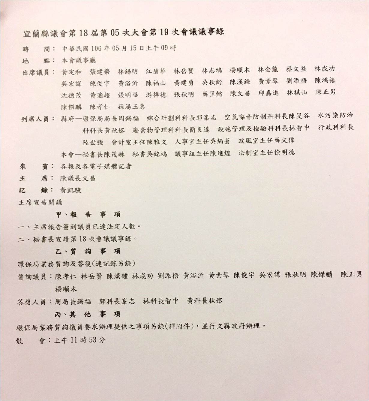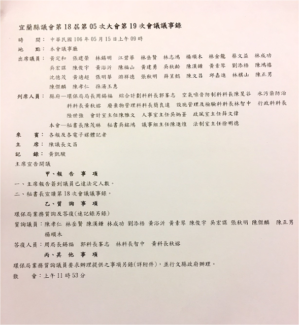 宜蘭縣議員2017上半年問政表現觀察報告~系列二~質詢表現觀察報告《確實出席 有效質詢 解決問題 正面影響》 文/社團法人宜蘭縣公民監督聯盟 宜蘭縣目前有33席縣議員,宜督盟志工於今(2017)年五月議會開議期間,每日輪派志工到議場監督,除了每天點名6次,並紀錄議員主要質詢內容,選出有效質詢內容,並根據宜蘭縣議會議事錄統計每位議員質詢次數,經過20天,以每一次會議(即每一天上午或下午)是否發言質詢為統計。在40次的會議中,有議員在22次會議中發言質詢,也有議員僅發言1次(請詳見附件)。 議員質詢次數統計, 質詢次數在20次以上名單如下:陳鴻禧、黃定和 質詢次數在15-19次名單如下:黃建勇、黃浴沂、陳福山、陳傑麟、陳漢鍾、吳宏謀、張明華、江碧華、陳俊宇、林成功、陳正男、劉添梧、林錫明、邱嘉進、黃素琴、張建榮、張秋明、林志鴻、吳秋齡、沈德茂。 質詢次數在10次以下名單如下:林金龍、楊順木、蔡文益、陳孝仁。 宜督盟在統計次數的同時,更關心議員的質詢內容,因為1次有效的質詢,遠勝於10次無效的質詢,因此,在觀察志工選出了4段有效質詢的內容,分別是5月10日上午林岳賢議員質詢地方稅務局長;5月11日上午劉添梧議員質詢地政處長;5月15日下午邱嘉進議員質詢環保局長;5月18日上午黃浴沂議員質詢縣長等4段質詢,至於為何選出這四段,說明如下: 5月10日林岳賢議員質詢地方稅務局長:林岳賢議員透過一元支票道具,點出縣政府以34元掛號郵資寄出1元退稅支票的誇張行政作為,促使全國輿論關注,由地方到中央檢討退稅30元以下之標準作業流程(詳見質詢影片) 5月11日劉添梧議員質詢地政處長:劉添梧議員透過回顧上一會期,議會動用表決刪除公辦礁溪市地重劃的過程,點出執政黨從縣府到議會黨團無心推動公辦,甚至點出多位民進黨籍議員在與張前議長到歐洲旅遊後,立場就從公辦改為自辦,並在最後讓處長親口承諾公辦立場不變。(詳見質詢影片) 5月15日邱嘉進議員質詢環保局長:邱嘉進議員對縣政府環保局多年來對冬山蘇澳一帶飽受臭異味困擾提出質詢,並點出環保局在控制污染源的產生上,要不要給他們改善的時間,若沒有改善,該開罰就要開罰。並對於四月份開始,全國都在推動空氣盒子,但宜蘭縣卻都是由民間在推動提出質詢,要求環保局主動從廟宇開始建置,讓宜蘭縣山水也要有好空氣。(詳見質詢影片) 5月18日黃浴沂議員質詢縣長:黃浴沂議員多年來關注員山鄉逸仙村、內城村、尚德村村民20年來飽受豬糞惡臭之苦;在持別在縣長施政總質詢時,帶領鄉民到議會陳情,並代表遞交陳情書,讓縣長當場向鄉民表達歉意,並承諾一個月內親自到場了解,還給鄉民沒有臭味的居住空間,縣政府環保局並在第二天即到場開單告發三家養豬場,有效為選民發聲。(詳見質詢影片) 我們也看到許多議員(例如黃定和、陳漢鍾、林岳賢、薛呈懿議員等)會將自己的質詢影片,透過社群媒體(臉書FB粉絲頁、LINE群組等)分享給選民知道,對此,我們也鼓勵公民主動上議員的臉書按讚,因為這樣的作為就像公益團體在網站上公布捐款徵信、財務收支狀況、年度成果報告一樣,是對社會大眾的一種責信,宜督盟透過議場內觀察,真實呈現觀察成果,期待透過有效質詢影片的分享,讓公民更加了解議員用心為民喉舌,讓優秀的議員連任,讓怠惰的議員知難而退,退出政壇,當公民意識覺醒時,「烏魯木齊」的議員就無法在民主殿堂上立足。 宜督盟根據宜蘭縣議會議事錄統計每位議員質詢次數。 延伸閱讀 相關新聞報導 丁神父助弱,宜蘭人感念 文/朱達明(陳定南教育基金會發展委員) 丁松筠神父病逝,在他一手募資興建的光啟社大樓裏,也是他畢生心力投入最多的傳播及公益事業的基地,真應了同樣是外國傳教士馬偕的那句話:「寧願燒盡,不願朽壞」。 筆者日前在宜蘭礁溪聽到一個關於丁神父的小故事,礁溪天主堂羅文思神父兼辦文聲復建院,幫助小兒麻痺患者自立自強,卅幾年前經費一度捉襟見肘,剛好一九八四年香港新藝城與台灣合作、孫越和陶大偉主演的一部勵志電影「笑匠」正要上映,經由丁松筠神父奔走,該片監製虞戡平導演等人促成,電影劇組從票房收入中捐出十七萬元,幫助文聲復建院解了燃眉之急,劇組還在拍攝地點台北老爺酒店招待文聲復建院所收容行動不便的青少年,吳宇森導演、孫越、劉瑞琪、江霞、監製虞戡平也到場和大家分享人生經驗,並致贈小禮物電子計算機,鼓勵他們就像片中的身障兒童,讓自己的生命發光發熱,丁神父善用他的影響力,默默為社會播下了更多愛的種子。 「德不孤,必有鄰」,羅文思神父來自荷蘭,丁松筠神父來自美國,他們遠渡重洋,在台灣相遇,也在台灣成為一家人,不分族群和宗教,都會覺得台灣有他們真好。 延伸閱讀 <活動訊息> 2017第11屆台灣UN青年研習營 ![]() <活動訊息> 羅東博愛醫院FUN暑假童畫趣 ![]() <活動訊息> 宜蘭地方知識達人講堂 ![]() <活動訊息> 宜蘭國際童玩藝術節 ![]() |