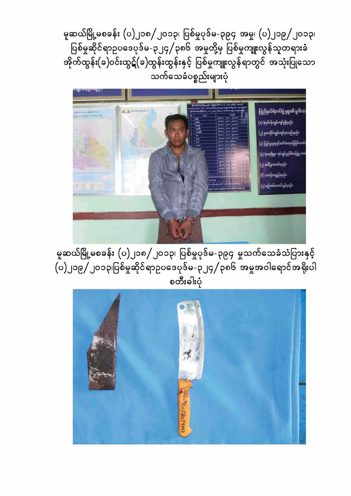 ၿဖဴးၿမိဳ႕ ဒုတိယအၾကိမ္ ေခါင္းၿဖတ္ တရားခံ(၂)ဦး ဖမ္းဆီးရမိ Posted: 16 Oct 2013 04:53 AM PDT ပဲခူးတိုင္း ေဒသၾကီး၊ ၿဖဴးၿမိဳ႕နယ္၊ ခင္တန္းၾကီးအုပ္စု၊ ကၽြဲမကူးေက်းရြာတြင္ (၁၂.၁၀.၂၀၁၃)ေန႔ ညေန(၆း၀၀)အခ်ိန္ခန္႕က ၿဖစ္ပြားခဲ့ေသာ ေခါင္းၿဖတ္ လူသတ္မႈ တရားခံအား ပဲခူးတိုင္း ေဒသၾကီး ရဲတပ္ဖြဲ႕မွ (၁၅.၁၀.၂၀၁၃)ေန႕တြင္ ဖမ္းဆီးရမိခဲ့ေၾကာင္း Myanmar News Now က သတင္းရရိွပါတယ္။ ပဲခူးတိုင္း ေဒသၾကီး ရဲတပ္ဖြဲ႕မွဴး ရဲမွဴးၾကီးၿမ၀င္း၏ လမ္းညႊန္မႈ၊ ၿဖဴးၿမိဳ႕နယ္ ရဲတပ္ဖြဲ႕မွဴး ရဲမွဴးစိုးသန္း၏ အနီးကပ္ ၾကီးၾကပ္မႈၿဖင့္ ၿမိဳ႕မ ရဲစခန္းမွဴး ဒုရဲမွဴး ေက်ာ္၀င္းႏွင့္ အထူးအမႈစစ္အဖြဲ႕၏ စံုစမ္းစစ္ေဆး ေဖာ္ထုတ္ခ်က္အရ (၁၅.၁၀.၂၀၁၃)ေန႕တြင္ ဖမ္းဆီးရမိခဲ့ျခင္း ျဖစ္ပါတယ္။ --- |